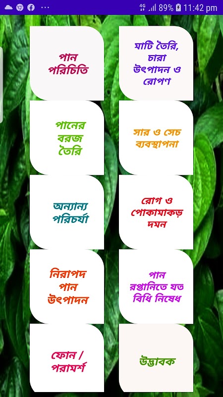 ৩. অ্যাপটিতে পানের বরজ তৈরি অংশে আছে- পানের বরজ তৈরি, উপকরণ, কাজের ধাপ, সতর্কতা, শেডনেট পদ্ধতিতে পান চাষ।