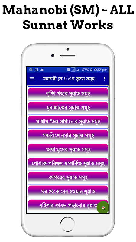 সুন্নাত বলতে বুঝায় মহানবী (সাঃ) এর রীতি,মহানবী (সাঃ) এর কাজ। এক কথায় মহানবী (সাঃ) জীবনীতে যে সকল কাজ করেছেন সেই সকল কাজ অনুসরন করাকেই সুন্নত বলে।আমাদের প্রিয় নবীর সুন্নাত পালন করা সকল মুসলমানদের অবশ্যই কর্তব্য। এক জন প্রকৃত মুসলমানের উচিত মহানবী (সাঃ) এর জিবনী মেনে চলা এবং তার সুন্নত সকল অনুসরন করা। আমাদের অ্যাপে প্রিয় নবী হযরত মুহাম্মদ (সাঃ) এর সকল সুন্নত সম্পর্কে জানতে পারবেন।