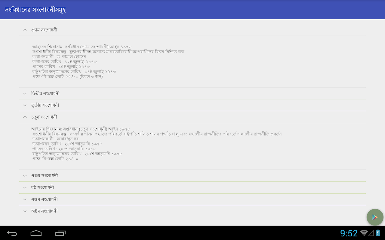 এই অ্যাপটির সাহায্যে বাংলাদেশ সংবিধানের সংশোধনীসমূহ জানতে পারবেন।