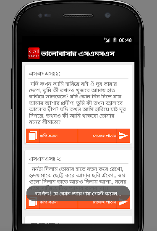 দেশের সেরা '' বাংলা এসএমএস '' ( Bangla SMS ) অ্যাপ এর পর এবার নিয়ে এলাম আরো একটি এসএমএস। সংগ্রিহীত ও বাচাইকৃত বাংলা এসএমএস ( Bangla SMS ) এর কালেকশন তৈরী করেছি আমরা। এগুলো আপনি ফেসবুক স্ট্যাটাসও দিতে পারবেন কপি বাটনে ক্লিক করে, তারপর ফেসবুকে পেস্ট করলে। এক ক্লিকেই শেয়ার করতে পারবেন, এসএমএস পাঠাতে পারবেন।