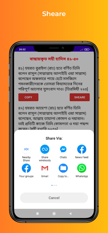 এই এপসটিতে উল্লেখিত হাদিস শরীফ বা হাদিসের বাণী গুলের বেশিরভাগই sahih bukhari এর hadess. তাছাড়াও muslim ও tirmizi shareef ও অন্যান্ন হাদিসসের কিতাবের হদিসও রয়েছে।
