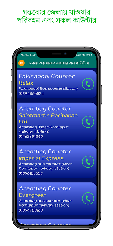 In Bus Counter Android App, you will get the bus counter address, bus counter mobile number, location, etc. of various transports from Dhaka to any district of Bangladesh. Collecting all the information in our app by visiting various counters. Later the possible amount of rent will also be added. Our initiative is to make the journey easier for travelers and travel enthusiasts.