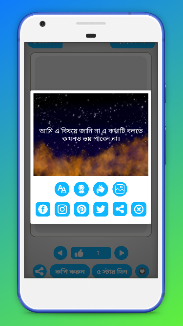 আমদের এই অ্যাপটিতে আপনাদের জন্য রয়েছে দেশি বিদেশী বিখ্যাত মণীষীদের অনুপ্রেরণামুলক বাণী বা উক্তি যা ব্যবহারে আপনাদের জীবন অনেক সুন্দর হয়ে উঠবে। আমদের এই অ্যাপটি পর্ব আকারে সাজানো হয়েছে আশা করি অ্যাপটিআপনাদের অনেক ভাল লাগবে। এছাড়াও আপনারা উক্তিগুলি সোশ্যাল মিডিয়াতে খুব সহজেই শেয়ার করতে পারবেন। এই অ্যাপটিতে আইনস্টাইন, হুমায়ুন আহমেদ, রবীন্দ্রনাথ ঠাকুর, কাজী নজরুল ইসলাম সহ আর অনেকের বিখ্যাত উক্তি সমূহ তুলে ধরা হয়েছে। এই অ্যাপতে আপনারা পাবেন বন্ধুতের উক্তি, উপদেশ মূলক উক্তি, জীবন বদলে দেওয়ার মত উক্তি অনুপ্রেরণামুলক বাণী বা উক্তি আর অনেক মূল্যবান কথা। তাই আর অপেক্ষা না করে আমাদের এই অ্যান্ড্রয়েড মোবাইল অ্যাপটি আজই ডাউনলোড করে নিন।