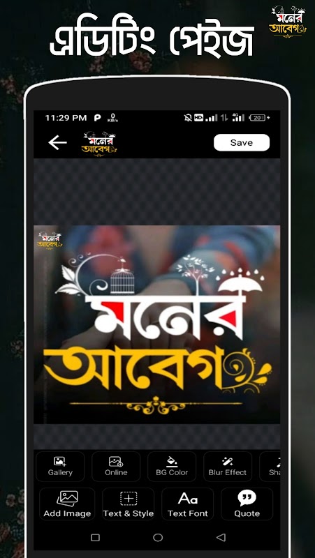 মনের আবেগ Abeg অ্যাপে অনেক ব্যাকগ্রাউন্ড এবং ছবিসহ অনেক স্ট্যাটাস status বাংলা এসএমএস ক্যাপশন টেমপ্লেট তৈরি করা আছে।