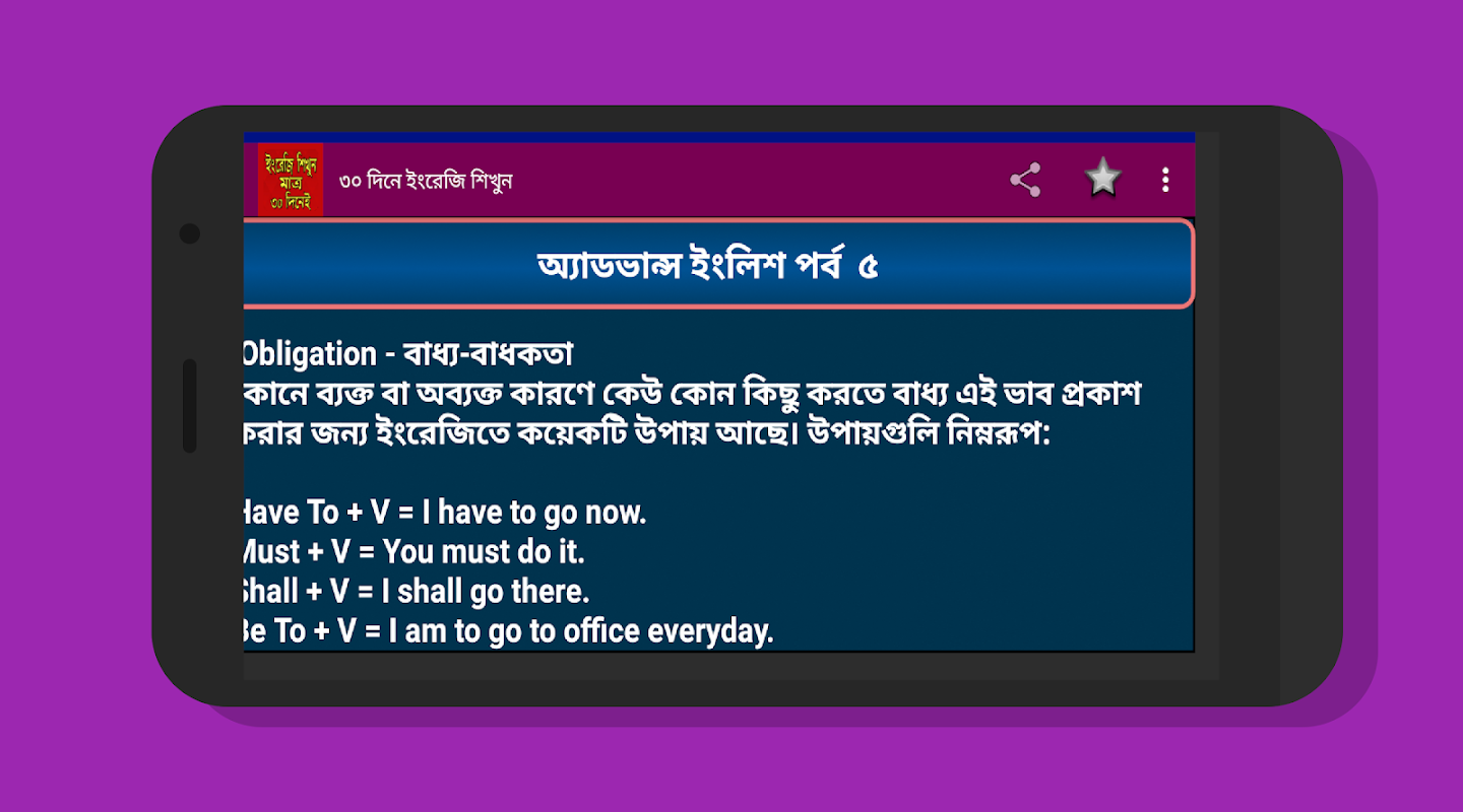 অ্যাপটিতে রয়েছে ইংরেজিতে কথা বলার মোট ১০ টি কোর্স basic and advance. এই কোর্স গুলোতে আপনারা পাবেন ইংরেজি শেখার শহজ কিছু উপায়।