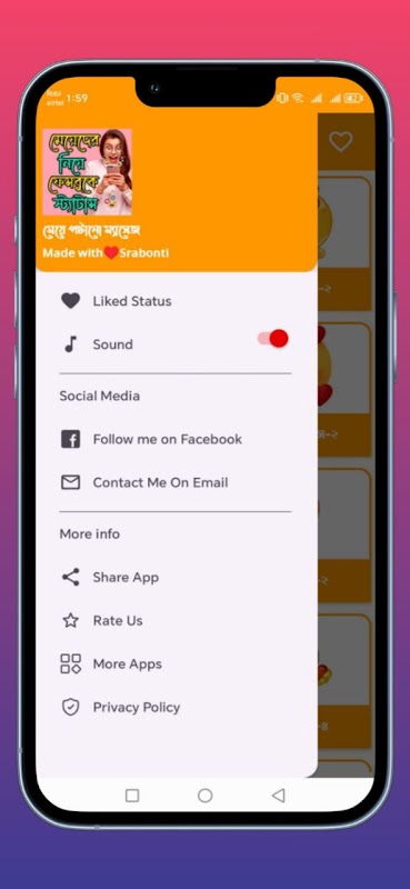 আজ এই অ্যাপসের মাধ্যমে আমরা মেয়েদের সাথে ফেসবুকে স্ট্যাটাস নিয়ে আলোচনা করব। আমাদের আজকের এই অ্যাপটিতে আপনি মেয়েদের সাথে নতুন এবং নির্বাচিত ফেসবুক স্ট্যাটাস পাবেন।