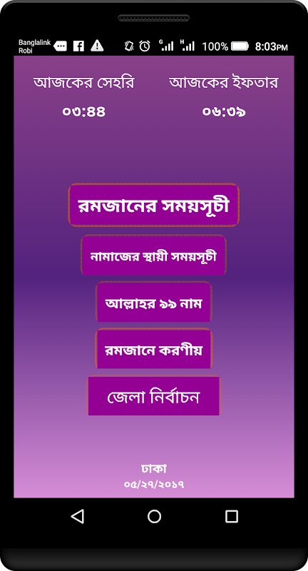 রমজানের সময়সূচীর এই এ্যপটি সাজানো হয়েছে আপনার এলাকার রমজানের সঠিক সাহরী ও ইফতারের সময়, নামাযের স্থায়ী সময়সূচী দিয়ে , এই সময়সূচীর সাথে আরও আছে কিছু আমল ও আল্লাহর ৯৯ নাম ।