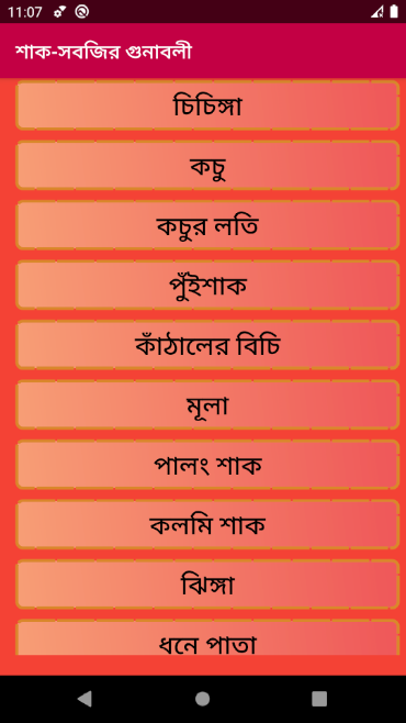 শাক-সবজির গুনাগুন এর বিস্তারিত বিবরণ দিয়ে অ্যাপটি তৈরী করা হয়েছে