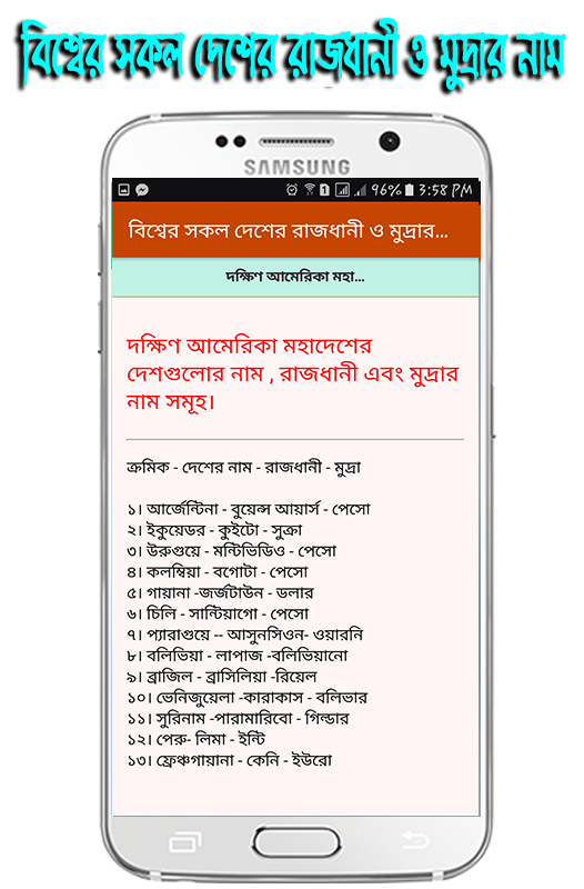 এশিয়া, ইউরোপ, আফ্রিকা, উত্তর আমেরিকা , দক্ষিণ আমেরিকা, এবং ওশেনিয়া মহাদেশের সব দেশ গুলোর নাম, রাজধানী এবং মুদ্রার নাম জানতে পারবেন আমাদের এই অ্যাপে ... এক নজরে বিশ্বের সব দেশের নাম, রাজধানী এবং মুদ্রার নাম।
