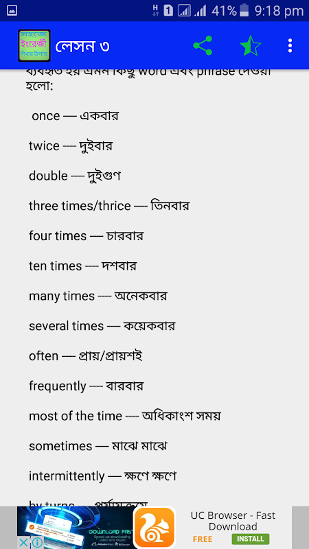 আমাদের এই স্পোকেন ইংলিশ অ্যাপস টি আপনার দৈনিন্দন জীবনে ইংরেজি শেখার সহজ উপায় উপায় গুলো নিয়ে আলোচনা করা হয়েছে. এটি মুলোত ইংরেজী শেখার কোর্স বা ইংরেজি শেখার বই, যেখানে বাংলা থেকে ইংরেজি ফর্মুলা এর মাধ্যমে ইংরেজি শেখার সহজ উপায় বলে দেয়া হয়েছে. ইংরেজি থেকে বাংলা অনুবাদ ও আপনি এই বাংলা অ্যাপস টিতে পাবেন. এই আপ্পস টি ব্যবহারের জন্য আপনি বাংলা টু ইংলিশ ডিকশনারী অথবা ইংলিশ টু বাংলা ডিকশনারী সাথে রাখতে পারেন. ফলে আপনার ইংরেজি শব্দ বাংলা উচ্চারন টি জেনে নিতে সুবিধা হবে. প্রচুর ইংরেজি ভোকাবুলারি জ্ঞান বাড়াতে হবে সাথে ইংলিশ গ্রামার চর্চাও করতে হবে. সঠিক ভাবে ইংরেজী শিক্ষা গ্রহনের জন্য নিয়মিত ইংরেজি গ্রামার বা ইংলিশ গ্রামার, ইংরেজি ভোকাবুলারি, ইংলিশ স্পোকেন ভালোভাবে চর্চা করতে হবে. 30 দিনে ইংরেজি শিখুন, 15 দিনে ইংরেজি শিখুন অথবা 30 দিনে ইংরেজি গ্রামার শিখুন ইত্যাদি আপ্পস বাজারে বহুল প্রচলিত. তবে সত্যিকার অর্থে 30 দিন বা 15 দিনে আপনি দিনে কোন জিনিসে দক্ষ হতে পারবেন না, প্রতিনিয়ত অধ্যবসায়ের মাধ্যমে আপনি ইংরেজী শিক্ষায় দক্ষ হয়ে উঠতে পারেন.