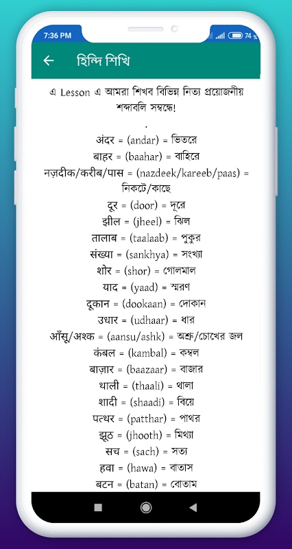 হিন্দি ভাষা বাংলা অনুবাদ সহ পড়তে এবং হিন্দি ভাষা বাংলা উচ্চারণ করতে এই এপ আপনাকে সাহায্য করবে। হিন্দি শিখতে হলে বাংলা উচ্চারণ সহ হিন্দি ভাষা শেখার আনন্দ রয়েছে। এর জন্য আপনাকে হিন্দি ভাষা শিক্ষা বাংলা বই পড়লে এবং বাংলা থেকে হিন্দি ভাষা শিক্ষা বই পড়লে দ্রুত শেখা যাবে।