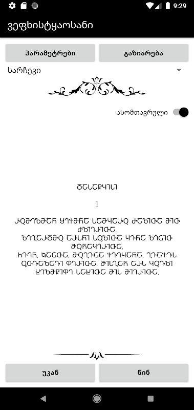 বই - অ্যাপ্লিকেশনটিতে Vepkhistkaosni-এর সম্পূর্ণ আধুনিক জর্জিয়ান পাঠ্য রয়েছে, এটি Asomtavruli পাঠ্যে স্যুইচ করা এবং যে কোনো সময় Mkhedruli-এ ফিরে যাওয়াও সম্ভব।