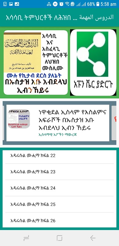 አዱሩሱል ሙሒማ ሊኣመቲል ኣመህ አስፈላጊ ትምህርቶች ለብዙሓኑ ማህበረሰብ በኡስታዝ አቡአብደላህ ኢብንኸይሩ ተቀርቶ የተጠናቀቀ ኪታብ ደርስ ነው ። ይህ አፕልኬሽን ኪታቧን በደንብ ተረድተናት ተግባራዊ እንድናደርጋት ያግዘናል። በህይወታችን ውስጥ ወሣኝ የሆኑ አስፈላጊ ትምህርቶችን አካትታ የያዘች ኪታብ ናት። ጠንክራችሁ ቅሩ ። ለቤተሰቦቻችሁ ለጓደኞቻችሁም አፕልኬሽኑን ሼርርርር በመደራረግ የዲን እውቀትን አስጨብጡ ።