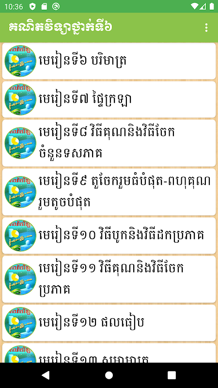 গণিত গ্রেড 6 হ'ল কম্বোডিয়ার প্রাথমিক শিক্ষার জন্য শিক্ষা মন্ত্রক থেকে প্রাপ্ত একটি প্রোগ্রাম। পাঠ আছে: