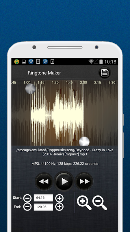 ترغب في الحصول على نغمة رنين لنفسك ، أو تريد قطع mp3 من الأغنية المفضلة لديك وجعل نغمة الرنين الخاصة بك ، وقطع أغاني mp3 cutter هو الحل . يمكنك تحديد الأغنية التي تريد تقلطيعها إلى نغمة الرنين ، ثم ضبط وقت البدء ووقت الانتهاء لقص الأغنية كنغمة رنين. بعد دلك يمكنك الحصول على الموسيقى التي تحبها مع قطع الموسيقى ، قطع الأغنية وصنع النغمة رنين المفضلة.