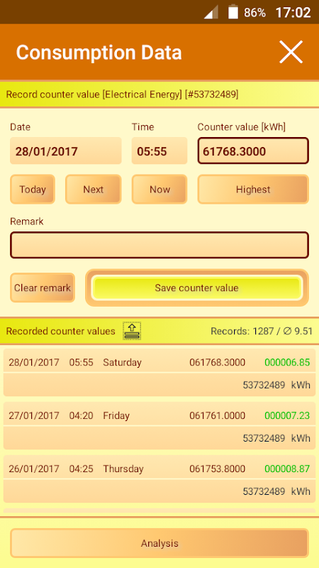 + automatic calculation of the 24-hours-consumption between two recorded counter values