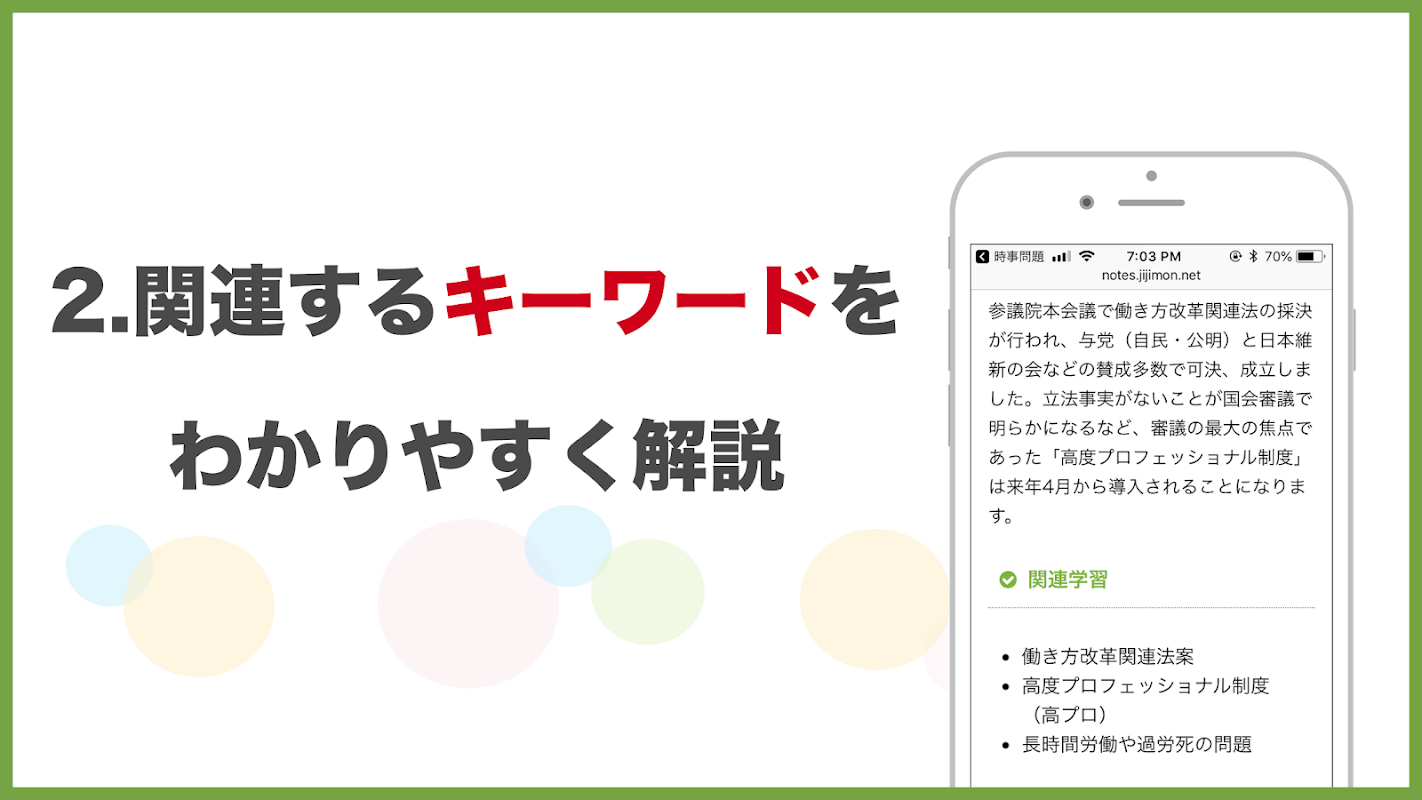 短時間で最新の時事問題や用語が勉強できる無料のアプリです。入試や就活、テストの予想問題を随時更新しています。2019年時事用語チェックリストを無料配布中です