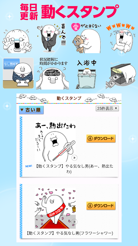 有料登録(※任意)すると、5,000個以上の通常スタンプの他、大人気の動くスタンプなど、やる気なし男スタンプが取り放題~毎日新作スタンプを続々公開中♪