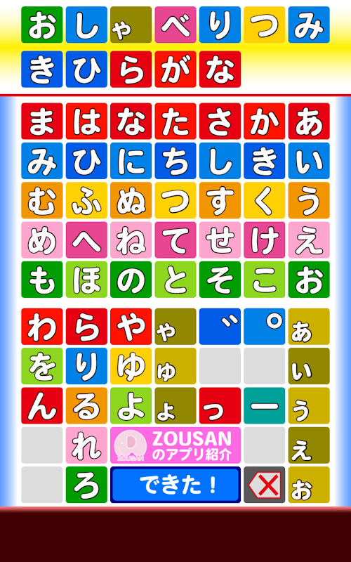 শিরিটোরি প্লে অ্যাপ। হিরাগানা ব্লকগুলি শিরিটোরির জন্য সারিবদ্ধ হতে পারে। যখন আপনি অক্ষর লাইন আপ, আপনি একটি শব্দ শুনতে পাবেন।