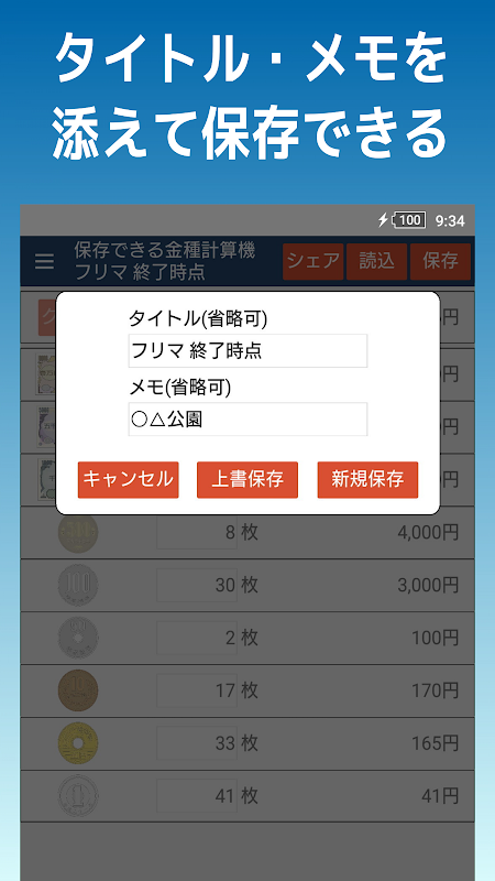 - 入力内容にタイトルとメモを添えて保存できる。(省略可能)