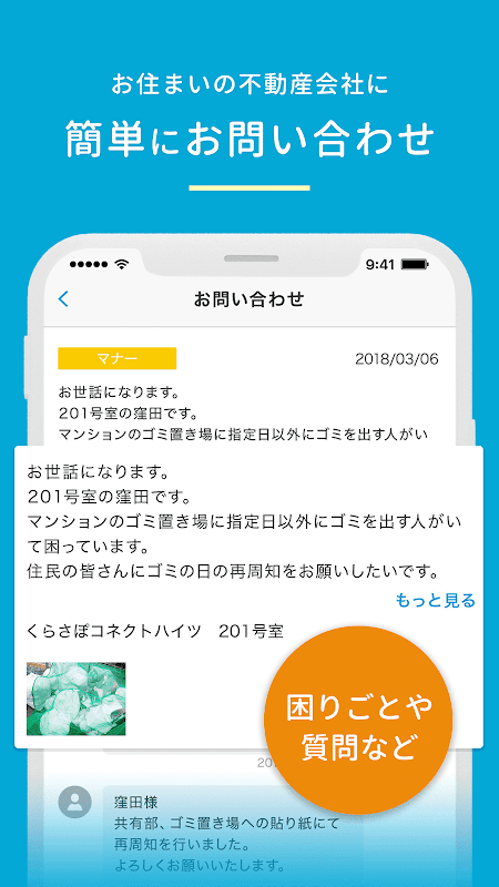এই অ্যাপ্লিকেশনটি দুই-দিকের যোগাযোগের সুবিধা দেয়, যেমন আপনার সম্পত্তি সম্পর্কিত সম্পত্তি পরিচালনার সংস্থার কাছ থেকে বিজ্ঞপ্তিগুলি গ্রহণ করা এবং সম্পত্তি পরিচালনার সংস্থার সাথে যোগাযোগ করা। উপরন্তু, আমরা আপনার জীবিকার জন্য দরকারী তথ্য সরবরাহ করব, যেমন আপনার সম্পত্তি সম্পর্কিত দরকারী তথ্য সরবরাহ করা।