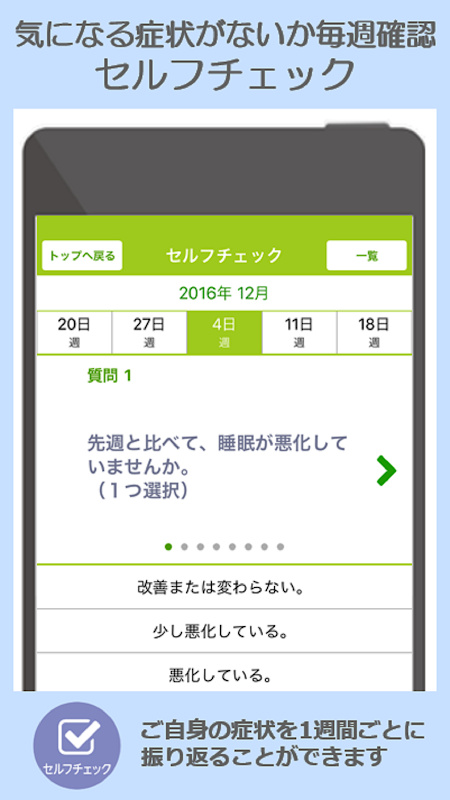 "কোকোরো কেয়ার" একটি অ্যাপ্লিকেশন যা "পানীয় ভুলে যাওয়া ওষুধ প্রতিরোধ করা", "ঘুমের ডায়েরি", "স্ব-চেক" এবং "ঘোষণার বিজ্ঞপ্তি" যেমন ফাংশন দ্বারা স্ব-পরিচালনাকে সমর্থন করে। আপনি দৈনিক প্রতিবেদনগুলিকে মাসিক প্রতিবেদন হিসাবে মুদ্রণ করতে বা ইমেল দ্বারা পাঠাতে পারেন, যাতে আপনি পরামর্শের সময় যোগাযোগের জন্য সেগুলি ব্যবহার করতে পারেন।