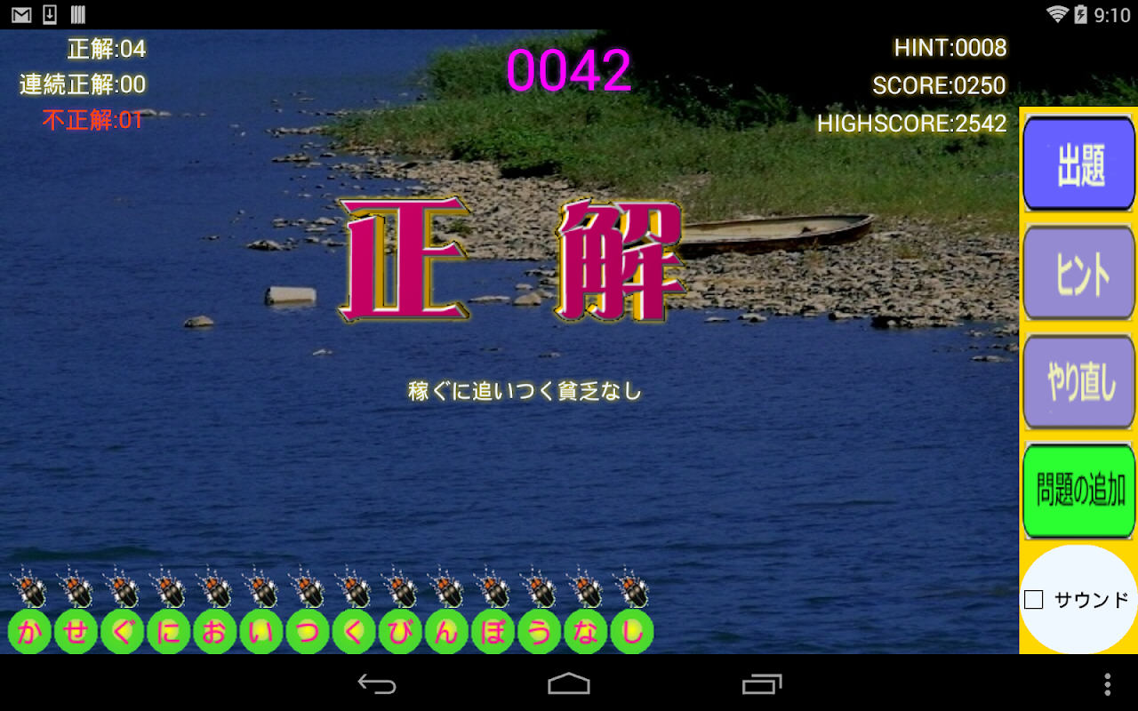 ゲームの目的は、画面に現れたことわざ蛍の各文字を出題文の語順どおりにタップすることを繰り返し、30語の言葉を正解することです。