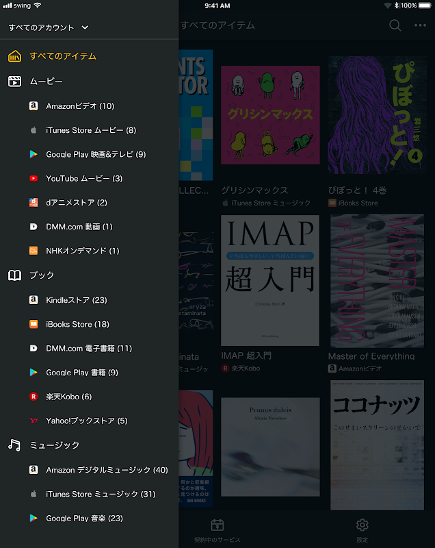 書籍・マンガ・動画・音楽など、様々なストアで購入したデジタルコンテンツの情報が一つのライブラリにまとまります。
