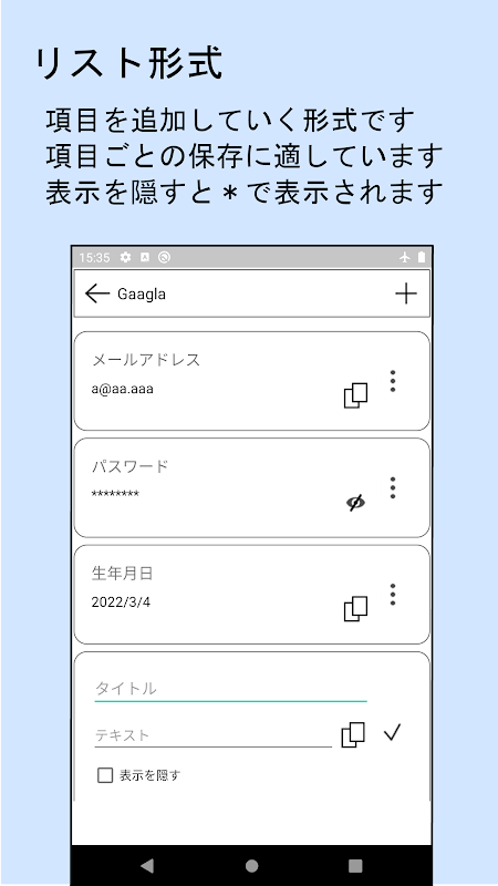 মেমো এবং পাসওয়ার্ডের মতো সমস্ত ধরণের পাঠ্য সংরক্ষণ এবং পরিচালনার জন্য উপযুক্ত একটি অ্যাপ। পাসওয়ার্ড দিয়ে লক করা যায়