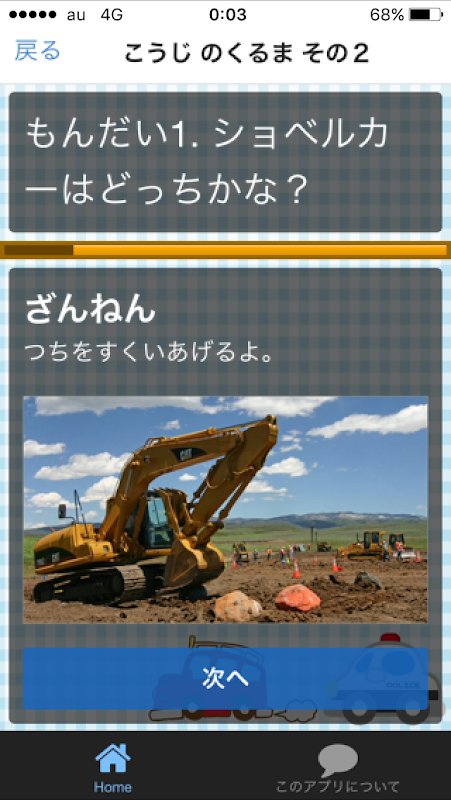 完全無料の幼児子供向けアプリ。働く車をあてる知育クイズです。子供と一緒に楽しく遊ぶことで知能学習に効果があります。泣きやみにもお役立ちますよ。