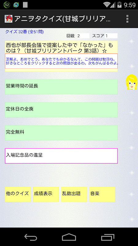 第一弾リリースは第5話分までのクイズ51問でリリースしました。