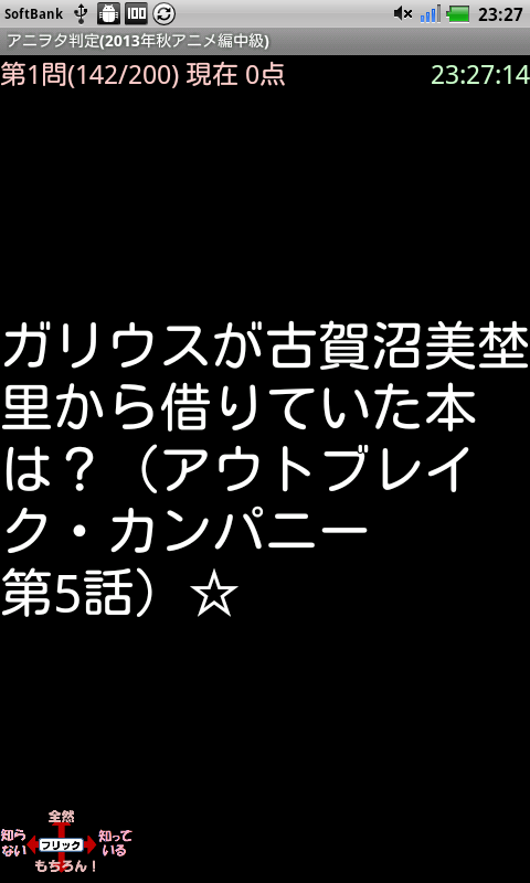 問題の解答を知っているなら右フリック、もちろん知っているなら下フリック、知らないのであれば左フリック、全然であれば上フリックしてください。これであなたのアニヲタ度が判定できます。