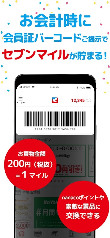 এছাড়াও, অ্যাপ-এক্সক্লুসিভ কুপন পান এবং কেনাকাটা করার সময় আপনার সদস্যপদ কার্ড বারকোড উপস্থাপন করে গ্রুপ জুড়ে সেভেন মাইলস উপার্জন করুন। সেভেন মাইলস ন্যানাকো পয়েন্ট এবং দুর্দান্ত পুরষ্কারের জন্য বিনিময় করা যেতে পারে।