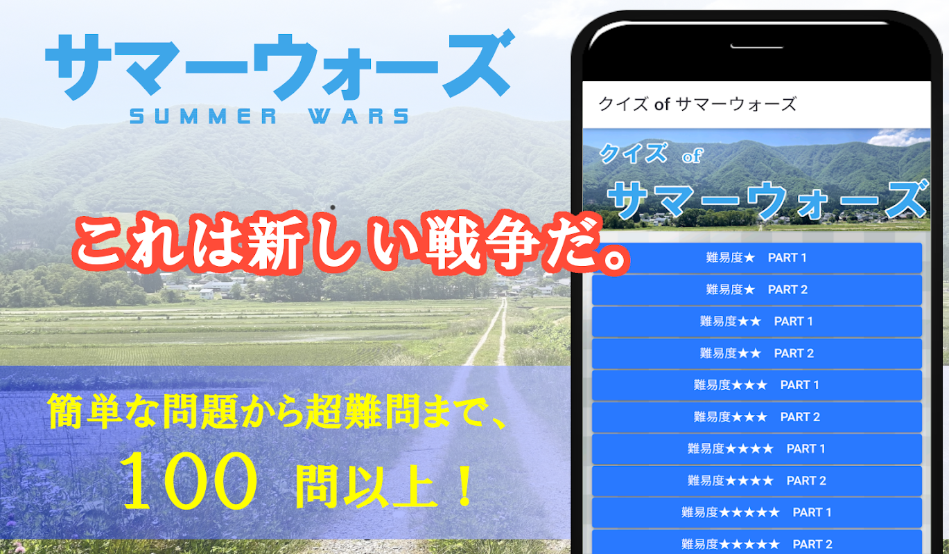 このアプリでは、映画『サマーウォーズ』のストーリー、キャラクターや各種エピソード、音楽や公開情報など、あらゆる問題が、難易度別に出題されます。