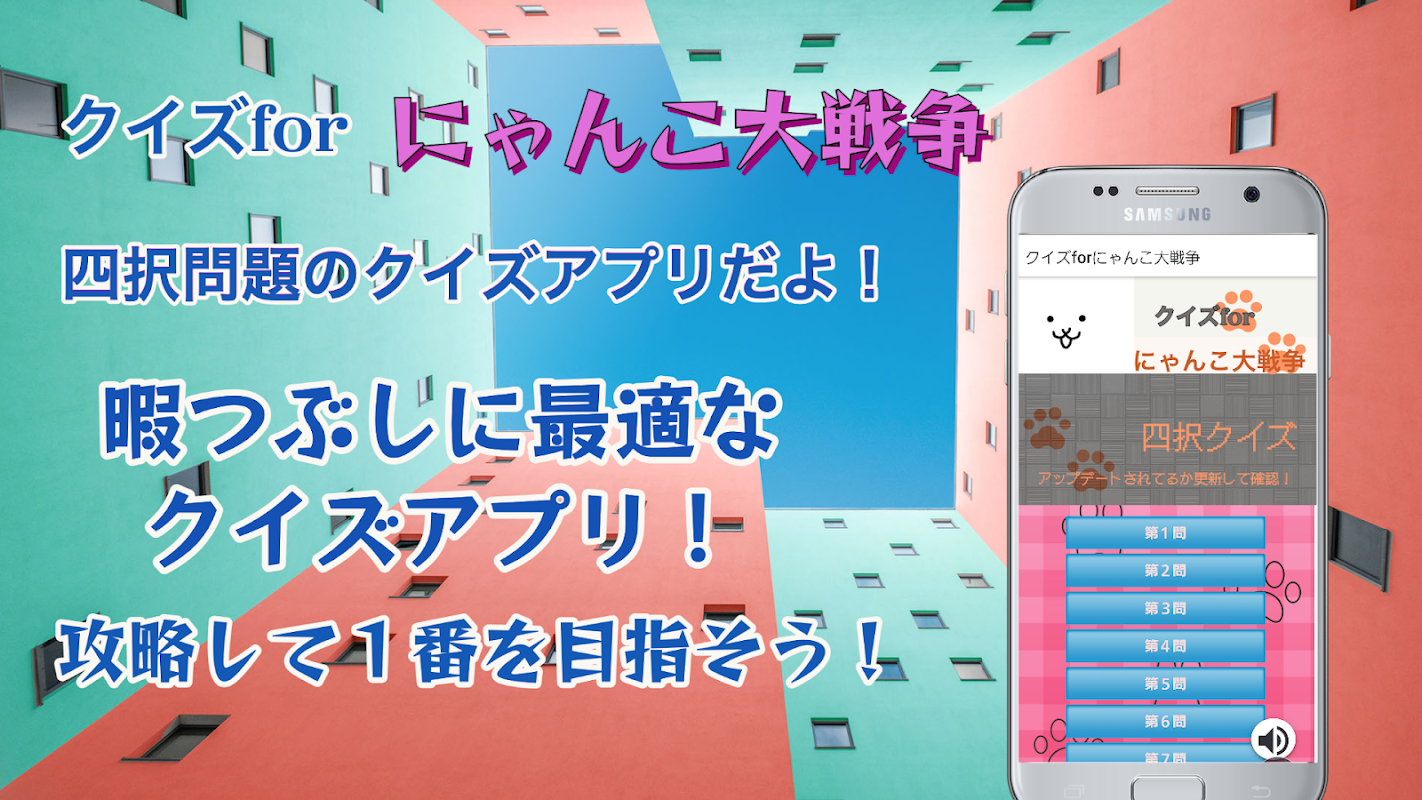 にゃんこ大戦争(にゃんこだいせんそう、英文表記:The battle cats)は、ポノスより2010年に配信された携帯電話向けゲームソフト、およびそれを基にした2012年11月15日に配信されたiOS・Android用のアプリケーションソフトウェア(横スクロールタイプのタワーディフェンスゲーム)。無料で基本プレイは可能であるこのアプリは、にゃんこ大戦争の非公式四択クイズアプリです。