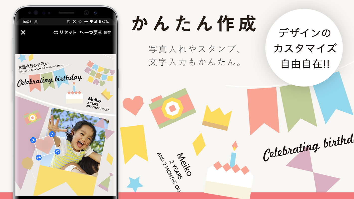 スタンプやメッセージも追加できるので、自分だけのオリジナルデザインも作成できます。