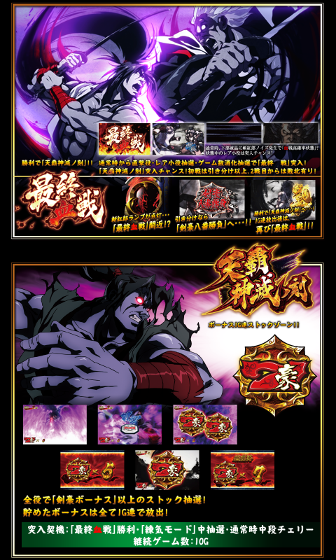 七人の敵を連続撃破して宿敵・天草四郎時貞に挑む「剣豪八番勝負」と、そこから突入する3つのボーナスの連鎖が生み出す「剣豪ループ」が本機の大きな特徴となっている。