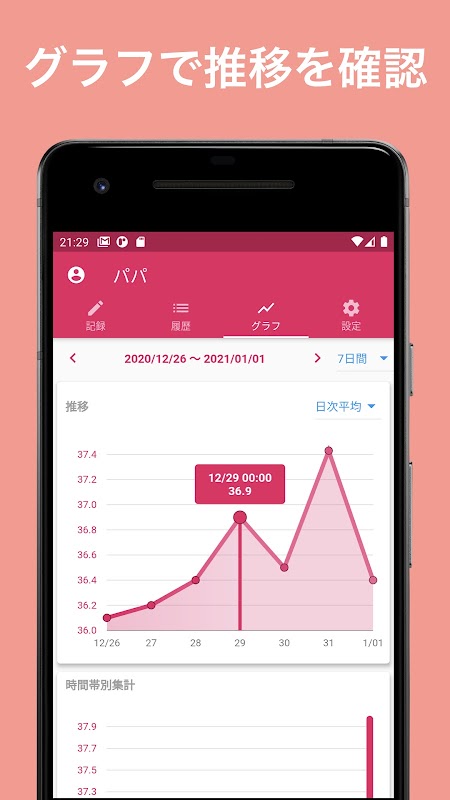 এটি একটি বিনামূল্যের অ্যাপ যা শরীরের তাপমাত্রা রেকর্ড করে। সহজ স্ক্রিন এটি পরিচালনা করা সহজ করে তোলে। আপনি একাধিক ব্যক্তির শরীরের তাপমাত্রা রেকর্ড, তালিকা এবং গ্রাফ করতে পারেন।