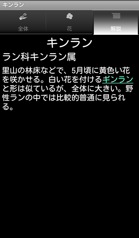 全体画像、花のアップ、葉のアップなど詳細な画像と判別のポイント、名前の由来などの解説で、見かけた植物を判別すると共に、野草の知識を身に付けることができます。