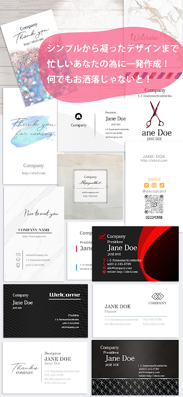একটি উচ্চ-পারফরম্যান্স অ্যাপ যা আপনাকে স্বজ্ঞাতভাবে ডিজাইন করতে দেয়। টেমপ্লেটের আকৃতি নির্বিশেষে যেকোনো টেমপ্লেট পরিবর্তন করা যেতে পারে। শুধুমাত্র একটি বোতাম দিয়ে ড্রাফ্ট/ব্যাক আপ ডেটা সংরক্ষণ করুন। আপনি হঠাৎ ভাঙ্গন বা মডেল পরিবর্তন সম্পর্কে চিন্তা করতে হবে না. এছাড়াও আপনি আপনার নিজের ফটো ব্যবহার করতে পারেন বা অ্যাপ থেকে QR কোড তৈরি করতে পারেন। এটি অন্যান্য কোম্পানি থেকে QR কোড সন্নিবেশ করা সম্ভব. আপনি একটি সীমাহীন সংখ্যক ফন্ট যোগ করতে পারেন। এটিকে আরও সুবিধাজনক করতে একটি স্ট্যাম্প জেনারেশন ফাংশন এবং একটি ড্রপার ফাংশন যোগ করা হয়েছে। প্রিন্ট করার জন্য আপনার আর প্রিন্টার বা পিসি লাগবে না। আপনি যখনই এবং যেখানে খুশি বিজনেস কার্ড আকারের কার্ড ডিজাইন এবং মুদ্রণ করতে নির্দ্বিধায়!
