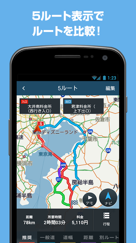 ・推奨ルートの他、一般道優先/道幅優先/距離優先/別ルートを含めた5ルート表示に対応