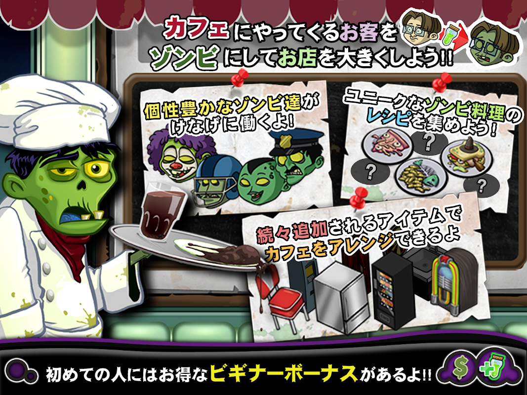 カフェにやってくるお客をゾンビに感染させよう!個性豊かなゾンビ達を使ってお店を大きくしてね♪