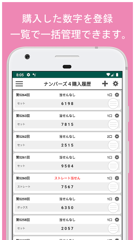 購入した数字の登録・管理機能付き、登録した数字を自動で当せんチェックします。