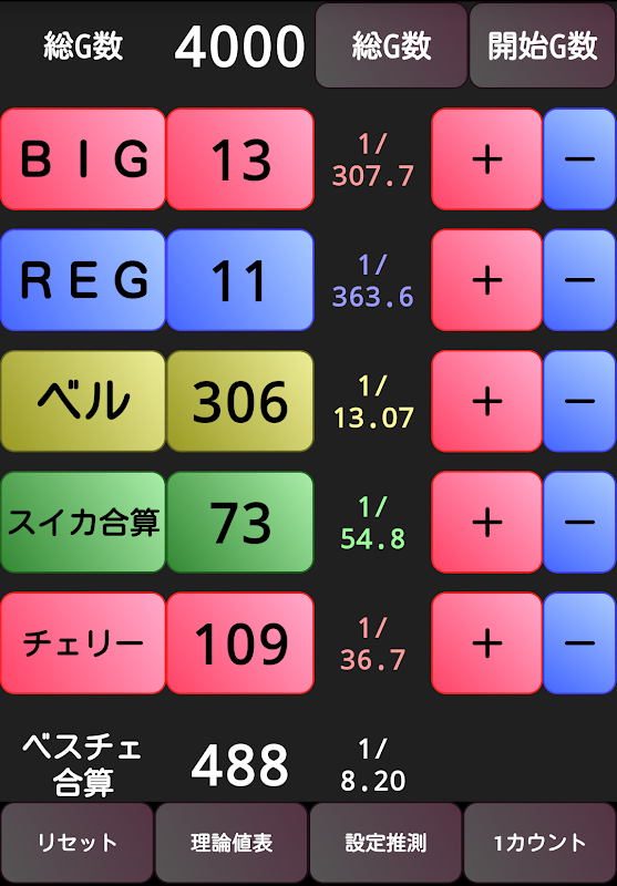 ※カウント項目名をタップするとカウント数表記が---に切り替わり無効化状態となり、設定推測に反映されなくなります。