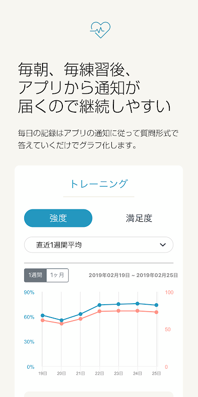 トレーニング後に、トレーニングの満足度・強度・練習量・パフォーマンスを記録し振り返ることができます。