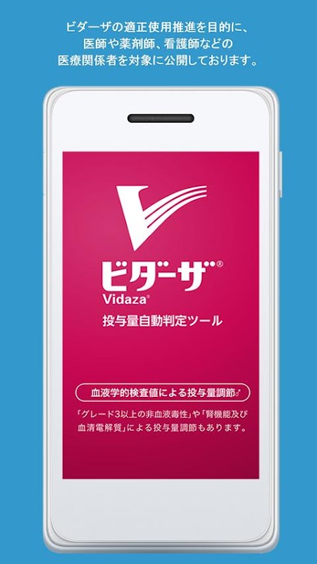 本アプリは、ビダーザの適正使用推進を目的に、医師や薬剤師、看護師などの医療関係者を対象に公開しております。