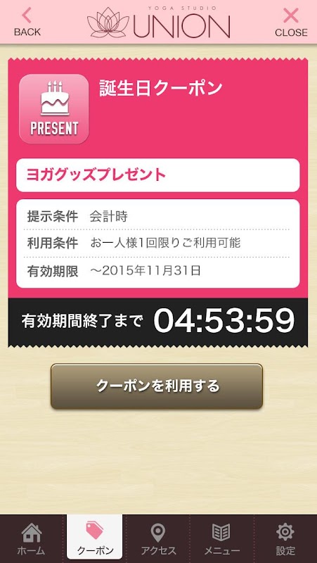 このアプリでは、ヨガスタジオユニオンの色々な情報やアプリユーザー限定のお得なサービスが手に入ります!