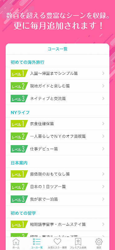 (※各コース内4シーンまでは、どなたでもお楽しみいただけます。全ての英会話シーンを楽しむために、プレミアム会員に是非ご登録ください。)