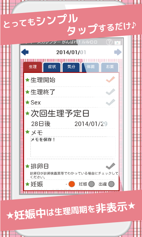 ・生理周期・期間の登録・不規則な方の設定・排卵日設定・妊娠出産時の生理周期表示停止
