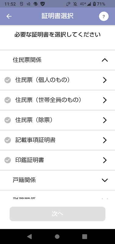 ・আবাসিক রেকর্ডের অনুলিপি (ব্যক্তিগত রেকর্ড), আবাসিক রেকর্ডের অনুলিপি (পারিবারিক রেকর্ড), আবাসিক রেকর্ডের অনুলিপি (সরানো), আবাসিক রেকর্ডে তালিকাভুক্ত বিষয়গুলির শংসাপত্র, সিল নিবন্ধন শংসাপত্র, পারিবারিক নিবন্ধন (সমস্ত বিষয়ের শংসাপত্র) (অপসারণ/ সংশোধনী মূল) পারিবারিক রেজিস্টার), পারিবারিক রেজিস্টার থেকে নির্যাস (ব্যক্তিগত বিষয়ের শংসাপত্র) (মুছে ফেলা/সংশোধিত মূল পারিবারিক রেজিস্টার), পারিবারিক নিবন্ধন পরিশিষ্ট (সম্পূর্ণ প্রমাণ), পারিবারিক নিবন্ধন পরিশিষ্ট (আংশিক প্রমাণ), পরিচয়পত্র, একক শংসাপত্র, আয়/ ট্যাক্সেশন/সাপোর্ট সার্টিফিকেট সার্টিফিকেট, ট্যাক্স পেমেন্ট সার্টিফিকেট, হালকা গাড়ির ট্যাক্স পেমেন্ট সার্টিফিকেট, শহর এবং প্রিফেকচারাল ট্যাক্স রিটার্নের কপি, স্থায়ী সম্পদ সম্পর্কিত সার্টিফিকেট, পরিদর্শন